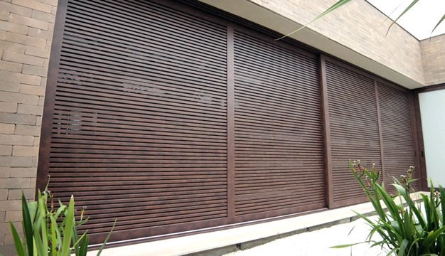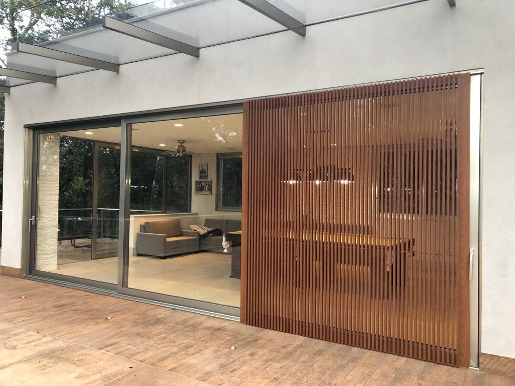 Brise amadeirado como porta de correr. Sua sutileza se integra às paredes externas sem chamar muita atenção.