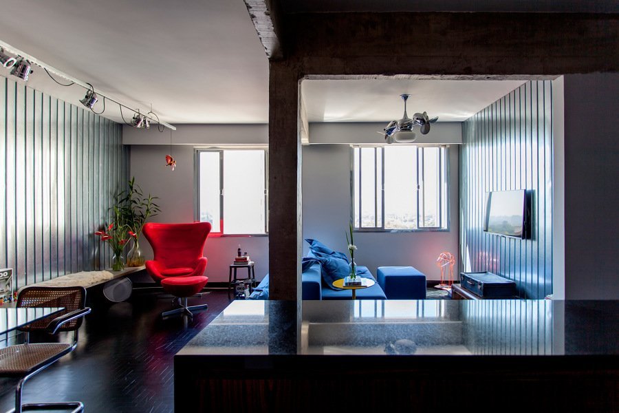 A parede revestida com telha de zinco, nesse caso, pode integrar vários cômodos da casa, sendo uma extensão do já existente telhado metálico ou um acabamento sutil para quebrar a monotonia visual de um espaço vertical vazio.