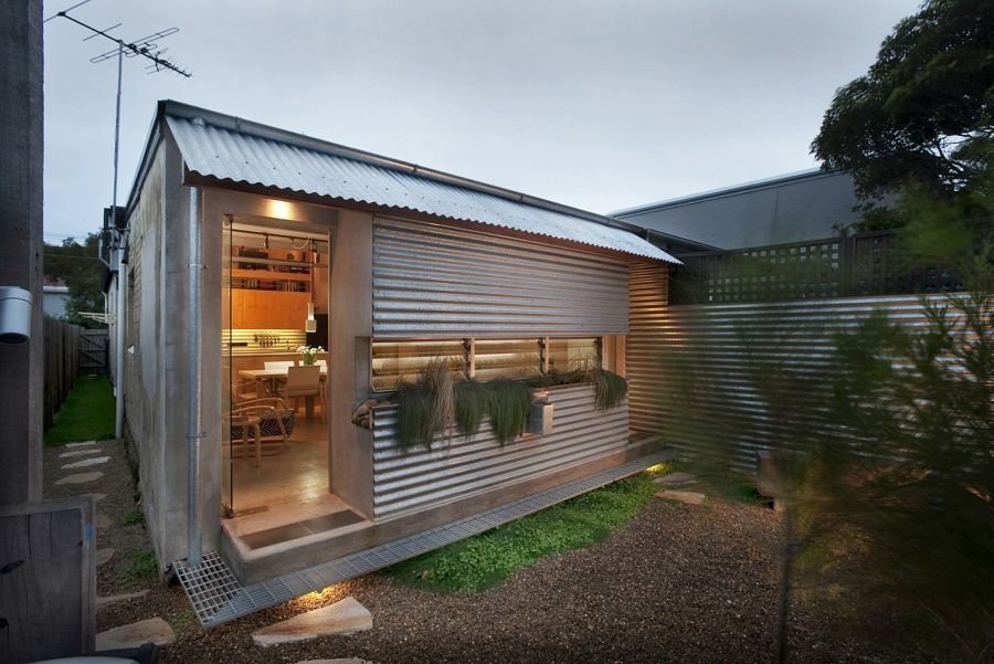 A parede revestida com telha de zinco, nesse caso, pode integrar vários cômodos da casa, sendo uma extensão do já existente telhado metálico ou um acabamento sutil para quebrar a monotonia visual de um espaço vertical vazio.